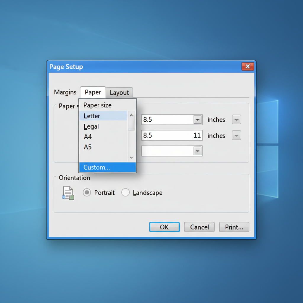In the Page setup window, open the dropdown and select Custom.