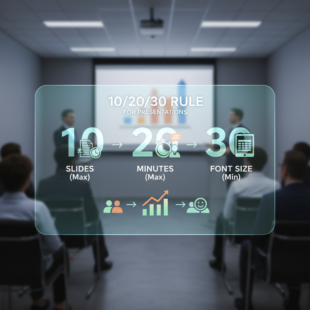 The 10/20/30 rule is a simple way to make presentations shorter, clearer, and easier to follow. Keep it to 10 slides, finish in 20 minutes, and use 30-point font so your audience can actually read your slides.